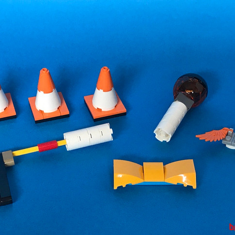 A quick look at bag 9 and 10, these are basically visual accessories - A target board, some road cones, a hockey stick, and bow tie, a moustache, and police siren, a set of shades, a mariachi shaker and my favourite and only functional piece, the shooter.